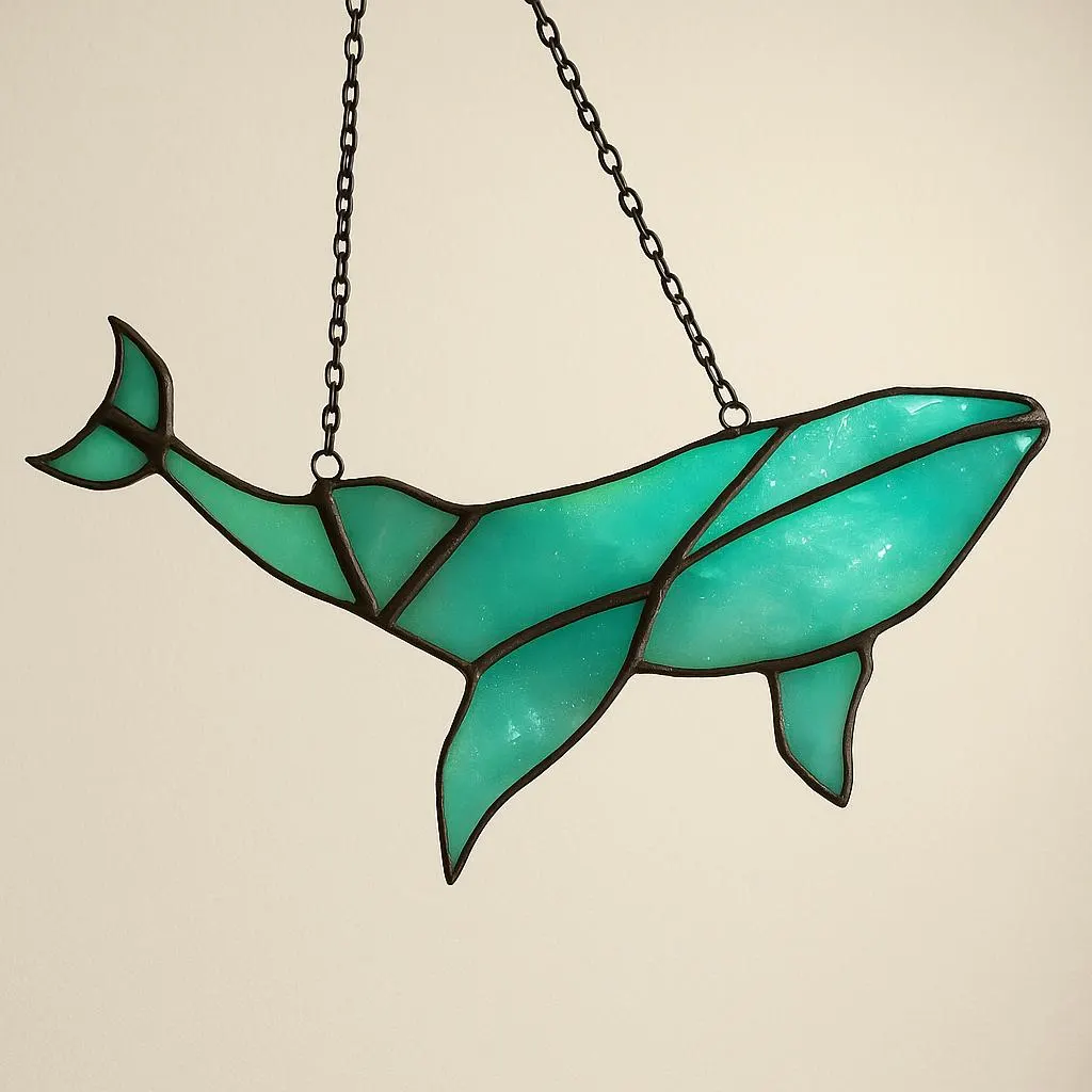 Each Whale Suncatcher is handcrafted using hand-cut stained glass, copper foil, and solder. Crafted in calming shades of blue and teal with a gentle iridescent glow, this piece captures the peaceful spirit of the ocean. Hung from a sturdy chain, it makes a beautiful coastal-inspired accent for windows, walls, or as a unique gift for ocean and marine life lovers.