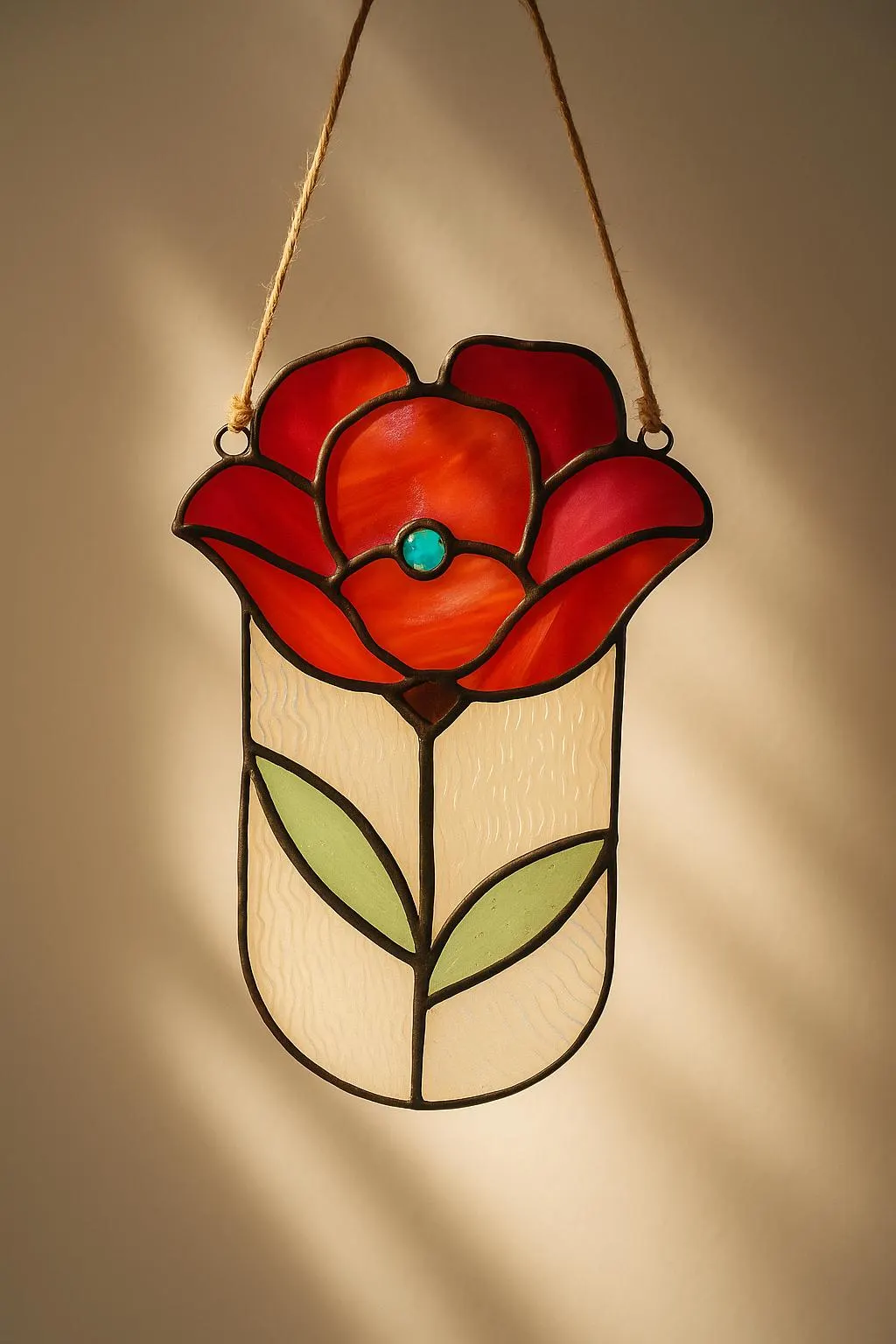 Each Rose Suncatcher is handcrafted using hand-cut stained glass, copper foil, and solder. Featuring vibrant red petals with a turquoise glass center and soft green leaves, this piece captures the warmth and romance of a blooming rose. It’s perfect for adding color and charm to your windows, or as a thoughtful gift for anniversaries, weddings, or special occasions.